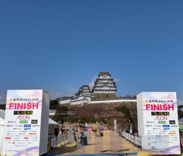 2月22日、姫路城マラソン2026が開催されました。今年もメディカルランナーとしてフルマラソンに参加してきました。当日は、ご覧のように晴天でした。マラソンを走るには少し暑すぎるくらいでしたが、沿道には多くの応援の方がおられ、雨や雪が降らずにすんだのは大変良かったです。随所で小中学生の演奏や地域の方の和太鼓などの応援がありました。また、個人でも歌を歌ったり、楽器を演奏したり、仮装したりと様々な応援をしていただきました。