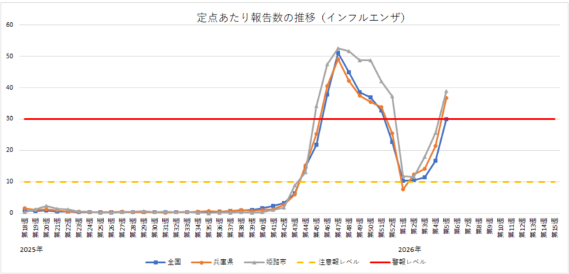B型はA型ほど流行しないことが多いのですが、グラフのように現在インフルエンザ流行は警報レベルに達しています。現在高校受験や大学受験の時期になっています。受験生の方々はご不安なことと思います。マスクの着用や手洗いなど感染対策をして感染しないようご注意ください。